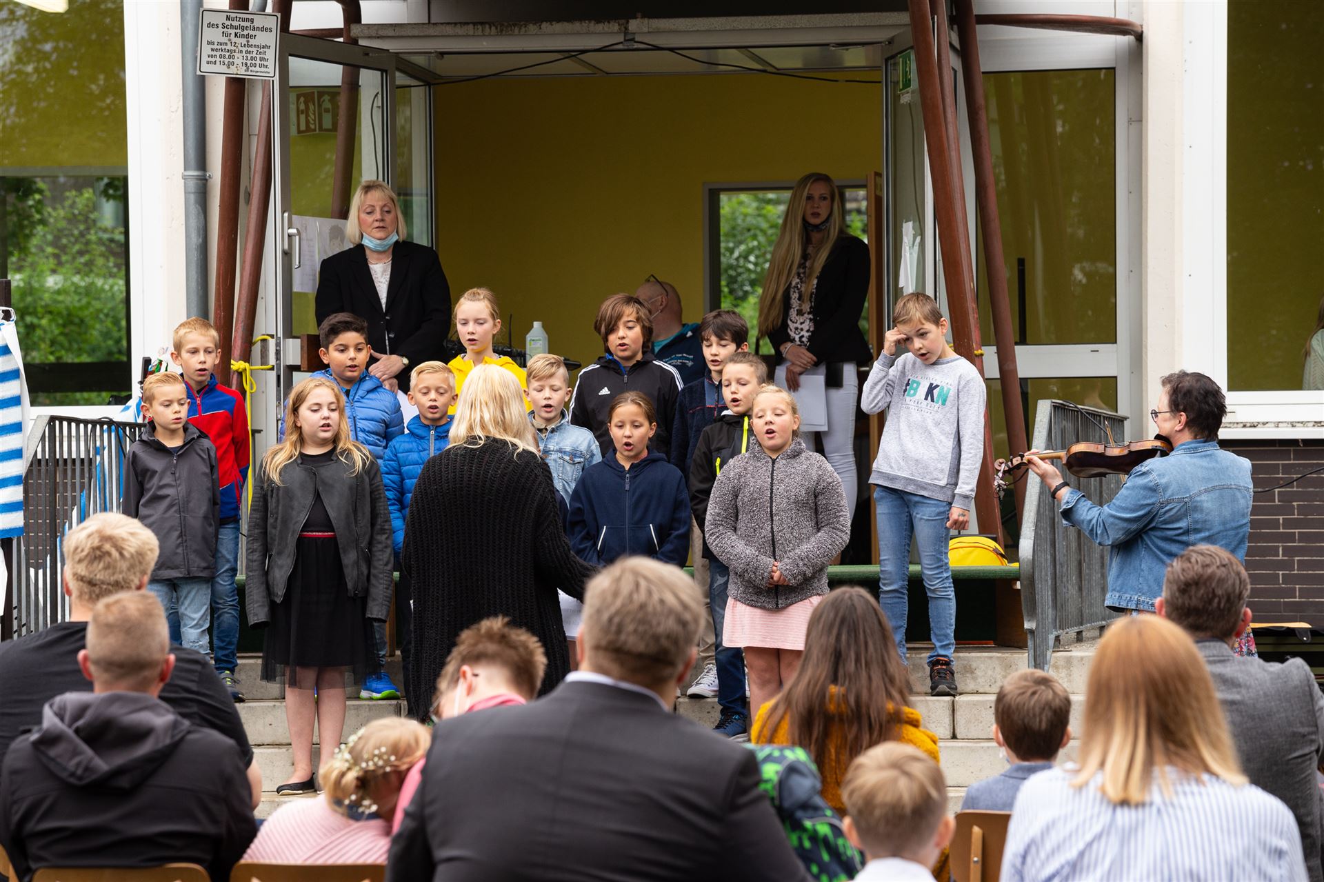 Die Schülerinnen und Schüler der Klassen 4a und 4c hatten ein kurzweiliges Programm gestaltet mit Cup-Song und Stand-up! Theater. Auch das Lied "Unsere Schule feiert heute" erklang, bevor der Kleine Rabe Socke und die Klassenlehrerinnen (1a Fr. Troff, 1b Fr. Schäfer) die Kinder auf ihrem Weg zur ersten Stunde begleiteten.