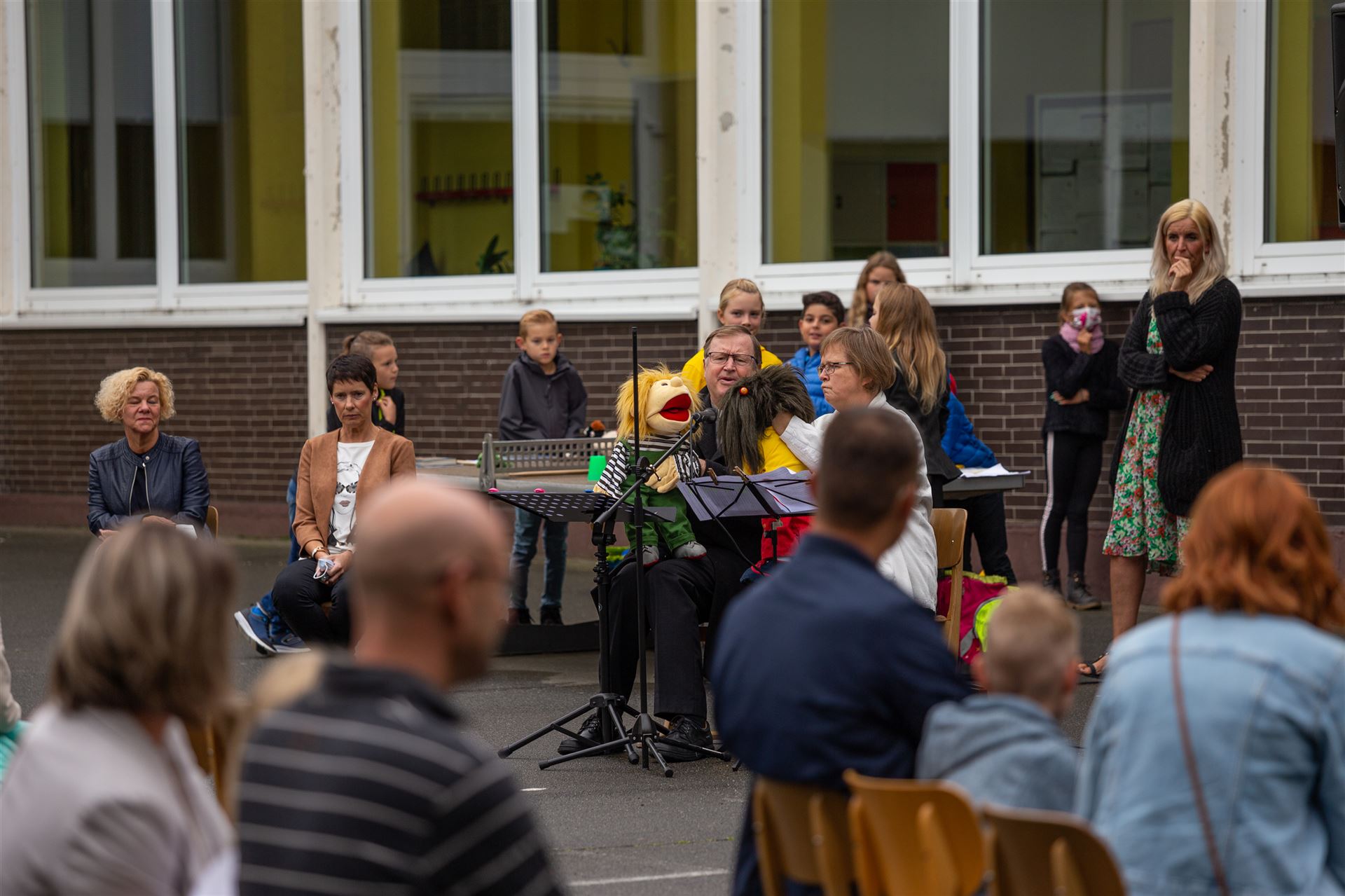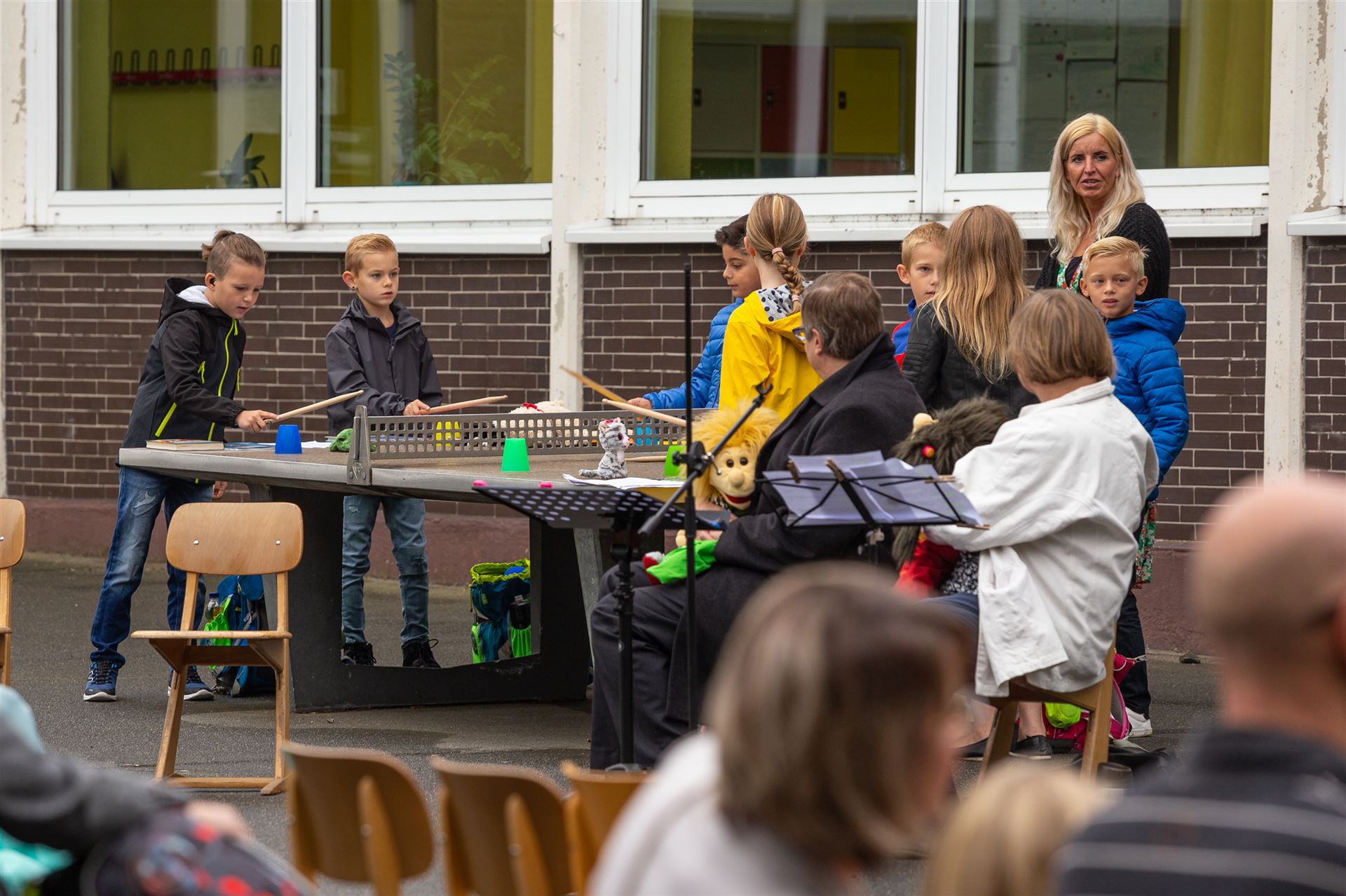 Die Schülerinnen und Schüler der Klassen 4a und 4c hatten ein kurzweiliges Programm gestaltet mit Cup-Song und Stand-up! Theater. Auch das Lied "Unsere Schule feiert heute" erklang, bevor der Kleine Rabe Socke und die Klassenlehrerinnen (1a Fr. Troff, 1b Fr. Schäfer) die Kinder auf ihrem Weg zur ersten Stunde begleiteten.